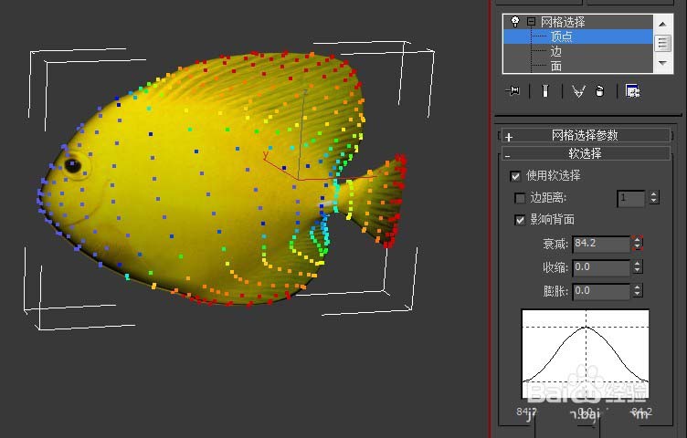 1、打開題目指定的路徑素材文件;選擇場景中的對象-魚,在修改器的“網格選擇”(沒有的話就自個添加一個“網格選擇”修改器)的子層級里選擇頂點并開啟軟選擇,在場景中選中魚鰭和魚尾部分,如下圖;