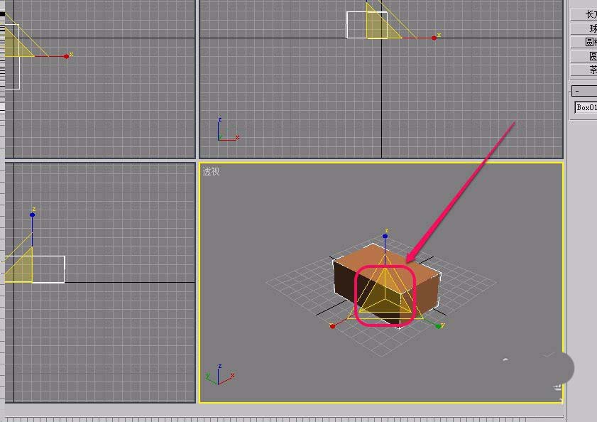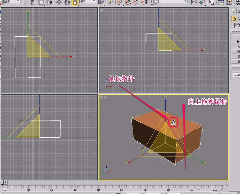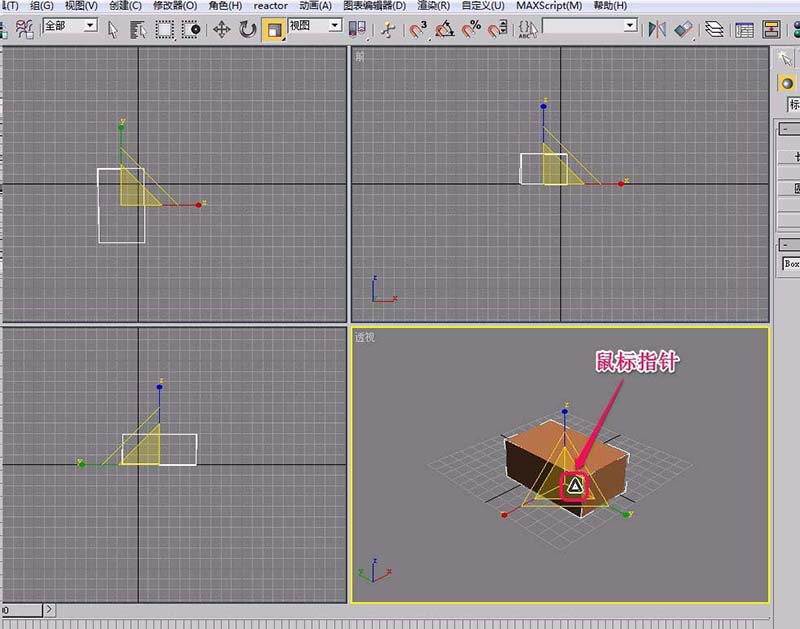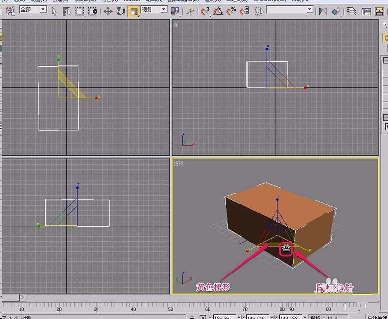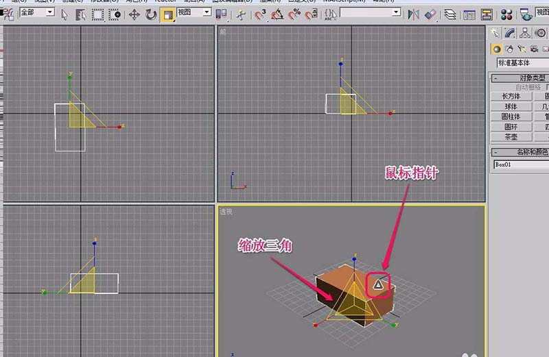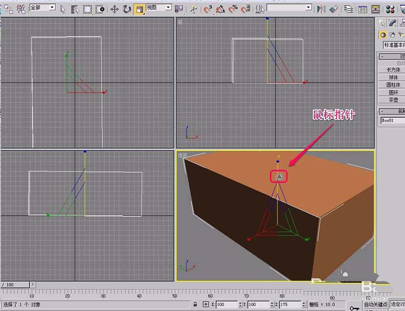 4、這時,鼠標(biāo)指針變成一個三角形形狀,長方體上面也出現(xiàn)了縮放三角。