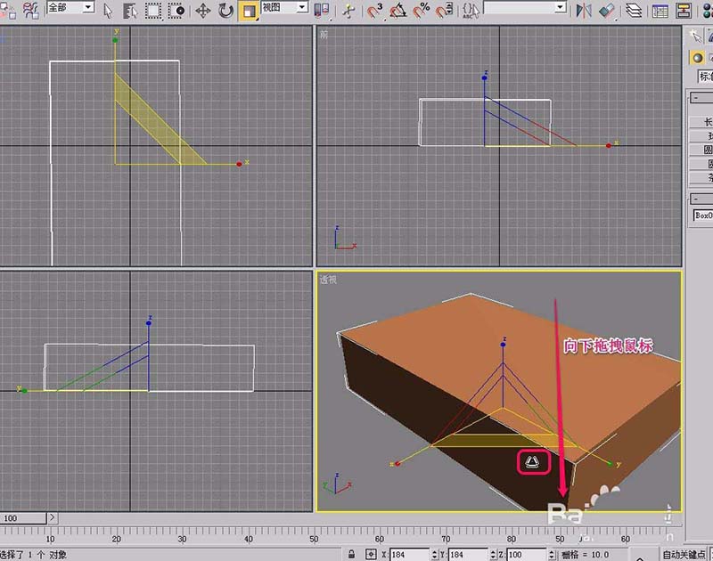 8、這時,按住鼠標(biāo)左鍵,向下拖拽,可以看到,長方體在x、y軸方向長度變大了,而在z軸方向高度沒有變化。