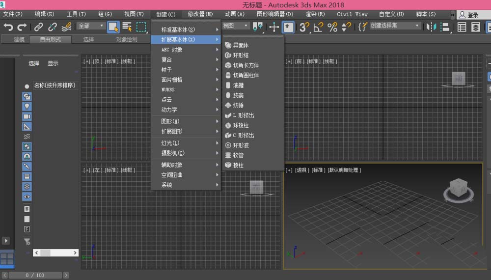 3、從最上面的操作界面中來找到創建,打開創建就可以看到擴展基本體,我們要介紹的這個異面體就在擴展基本體中,如圖