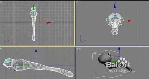 進入修改命令面板,進入“圖形”次物體層級進行編輯,使嘴部的根部稍微粗大一些。進入創建命令面板,創建一個“球體”作為復眼,使用“選擇并非均勻縮放”工具進行拉伸變形;然后繼續使用“編輯網格”工具對軀干部分進行編輯。