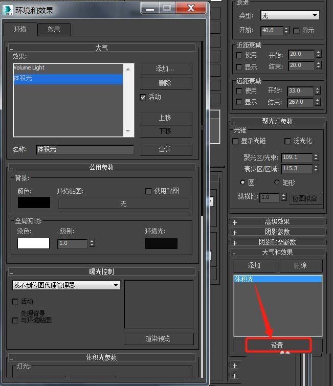 4、在設置的對話框下方調整體積光的一些參數,在調整過程中要并列開啟渲染器實時渲染,以便對應調整的參數效果。下圖就是調好的體積光效果圖。