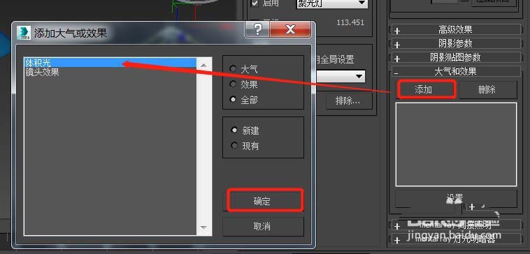 2、構畫后點擊其燈光,在它的修改器中可以對其進行參數修改(要對近距與遠距衰減進行一等量的設置,不然后續的體積光會無限延伸,除非有遮擋物);然后找到修改列表下方的“大氣與效果”一欄,點擊“添加”,選擇“體積光”,點擊確定;