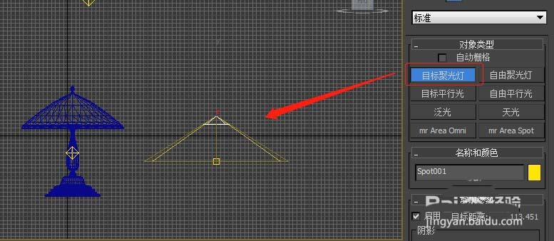 1、體積光是在燈光的基礎上添加的一種效果;首先在場景中我們要創建一盞燈光,下面為聚光燈為例,點擊“創建”-“燈光”-“標準”-“目標聚光燈”,在場景中創建(如下圖);創建后可以把燈光移動對齊到物質場景中去或等后面步驟完成后再移動到物質場景中去都可以;