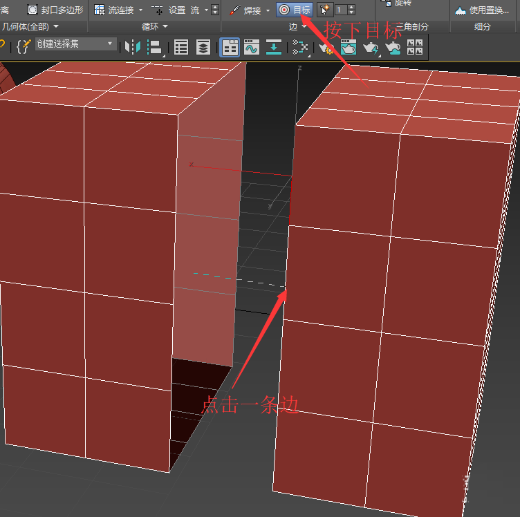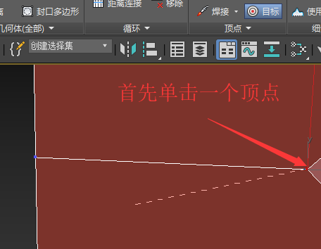 4、把一個(gè)頂點(diǎn)合并到另一個(gè)頂點(diǎn)上的辦法:目標(biāo)按鈕。按下目標(biāo)按鈕,點(diǎn)擊一個(gè)頂點(diǎn),接著點(diǎn)擊另一個(gè),第一個(gè)頂點(diǎn)會(huì)被合并到第二個(gè)頂點(diǎn)上。