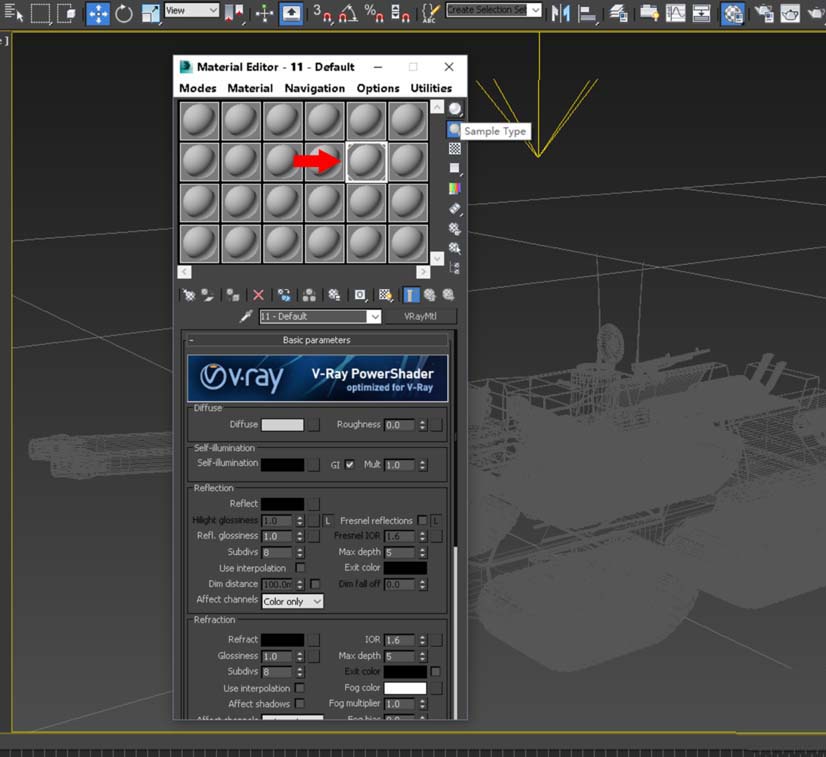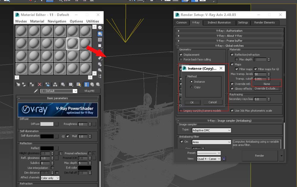 3、如圖所示,打開VR渲染面板,找到“Overr...”這一欄,關聯復制材質球