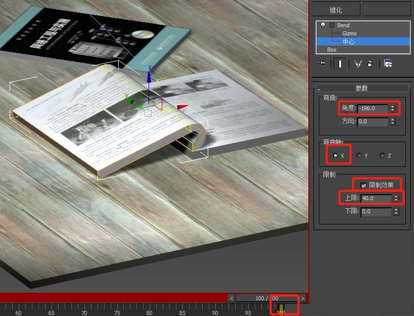 3、然后拖到100幀位置,在“彎曲”修改器內,把角度、方向、上限按題目要求輸入對應框里;這樣這個動畫就制作好了,點擊播放按鈕(快捷鍵“?”)就會看到書本彎曲、翻起、落下、展開的一系列效果。