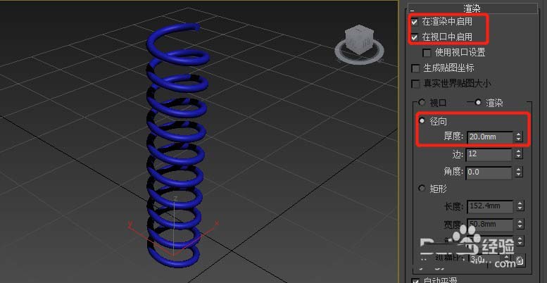 1、首先在場景中用二維圖形螺旋線創建一個彈簧,半徑、高、圈數等參數按題目要求輸入;在渲染里開啟可見的兩個勾選,渲染類型選徑向;