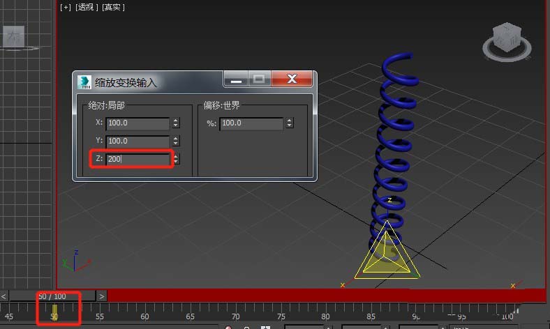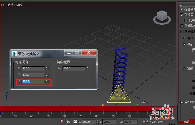 4、再拖到100幀位置,右健點擊工具縮放(上一次沒有關閉就不用),在絕對:局部的Z軸框內輸入100回車;這樣這個動畫就制作好了,點擊播放按鈕(快捷鍵“?”)就會看到彈簧拉伸效果。