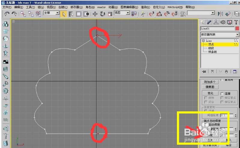 4、選擇上下兩個節點,單擊焊接,在選擇修改器列表中的樣條線,單擊輪廓。