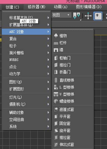 3、從最上面的主菜單欄中來找到創建功能,創建打開以后我們就可以看到AEC對象功能,鼠標移動到AEC對象上,就可以看到幾種類型的窗