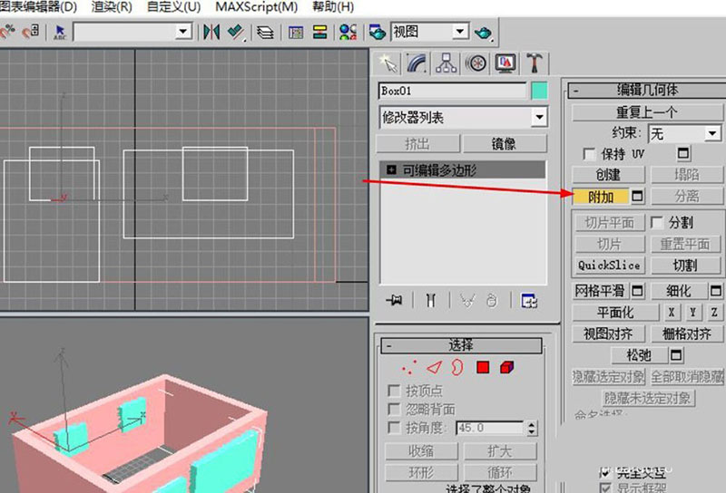 6、這里有一個重點,就是將被減去的對象進(jìn)行復(fù)加,將其中一個對象轉(zhuǎn)換成可編輯多邊形附加其他被減去的對象。