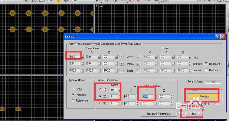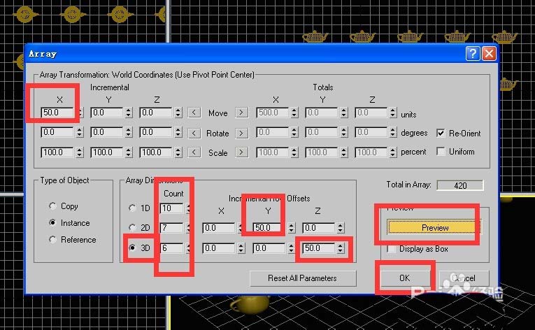 6、撤銷到第一步,一個(gè)茶壺的狀態(tài),然后點(diǎn)擊陣列標(biāo)志,調(diào)出陣列對話框,如下圖所示設(shè)置,然后點(diǎn)擊ok,顯示效果如下,這是一個(gè)x方向間距是50,共有10個(gè),y方向間距也是50,共有7個(gè),總共70個(gè)的陣列。