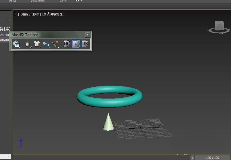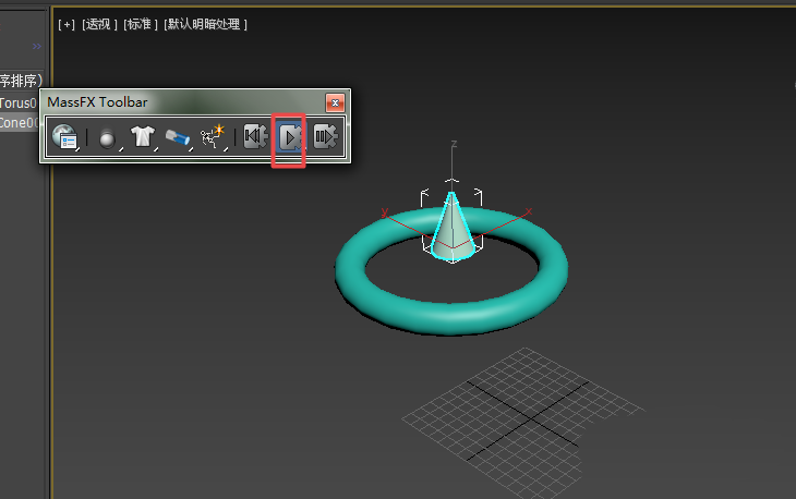 3、當點擊模擬時,發現圓錐體停留在圓環中而不落下,這是因為物理網格的緣故。