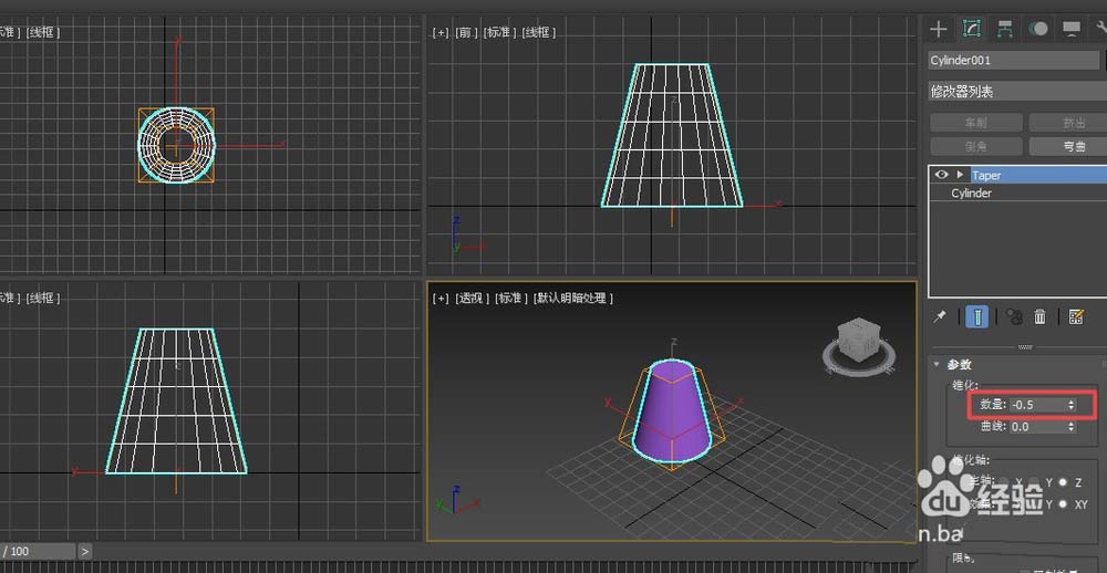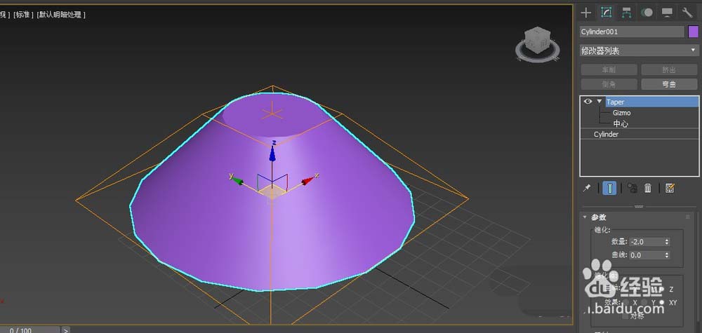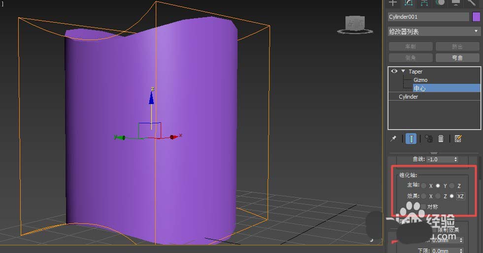 5、則再采用錐化修改器,圓柱的下端發(fā)生了錐化。