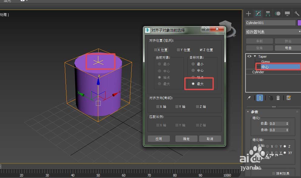 4、如果想讓圓柱下端錐化,則可以通過(guò)將錐化中心向上移動(dòng)。可以采用對(duì)齊工具將錐化中心移到圓柱的上表面。