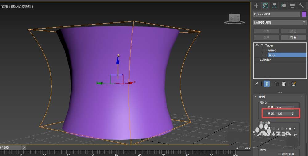 6、同理,將錐化中心移到圓柱的中間的話,圓柱的上表面和下表面同時(shí)產(chǎn)生錐化。當(dāng)曲線下輸入一定值,圓柱不但發(fā)生錐化,還具有一定的曲線,負(fù)值為向內(nèi)凹,正值為向外凸。