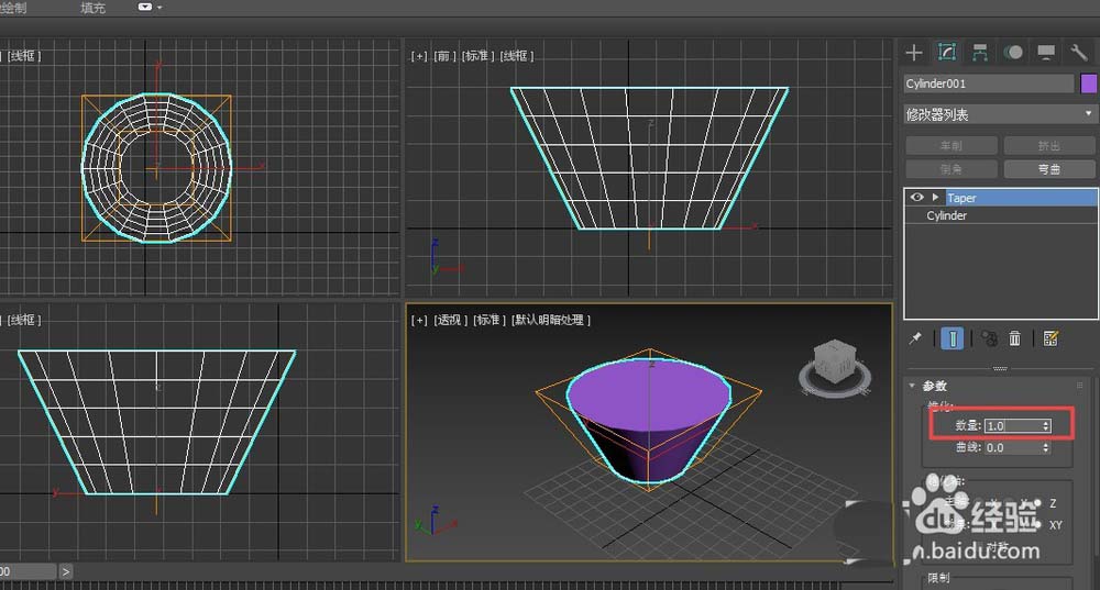 2、當(dāng)將修改面板錐化的參數(shù)下的數(shù)量改為1是,圓柱的上端向外發(fā)生錐化。