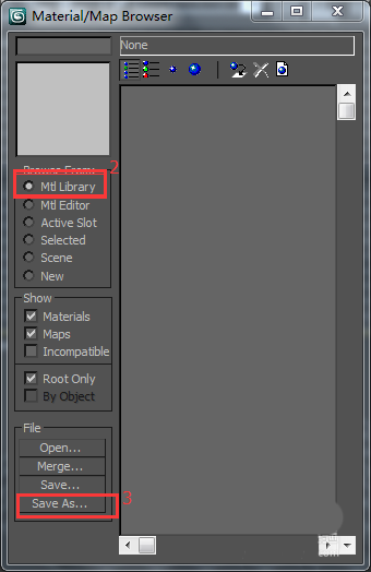 2、選擇第一個材質(zhì)球,調(diào)制一種"白乳膠漆“材質(zhì),然后單擊(獲取材質(zhì))按鈕,在彈出的【Material/Map Browser】(材質(zhì)/貼圖瀏覽器)對話框中,選擇窗口左側(cè)的【Mtl Library】(材質(zhì)庫),單擊【Save As】(另存為)按鈕,如下圖所示。