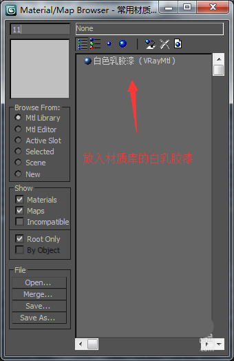 此時,已調(diào)配好的”白乳膠漆“材質(zhì)便保存到”常用材質(zhì)庫.mat“中了。