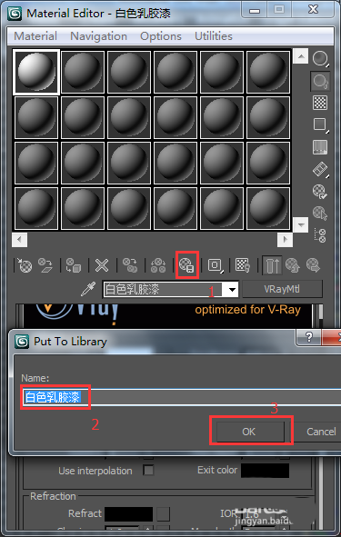 4、選擇剛才我們調(diào)至好的”白乳膠漆“材質(zhì),在【Material Editor】(材質(zhì)編輯器)窗口中單擊工具欄上的(放入庫)按鈕,在彈出的【Put To Library】(放入庫)對話框中單擊【OK】,如下圖所示。