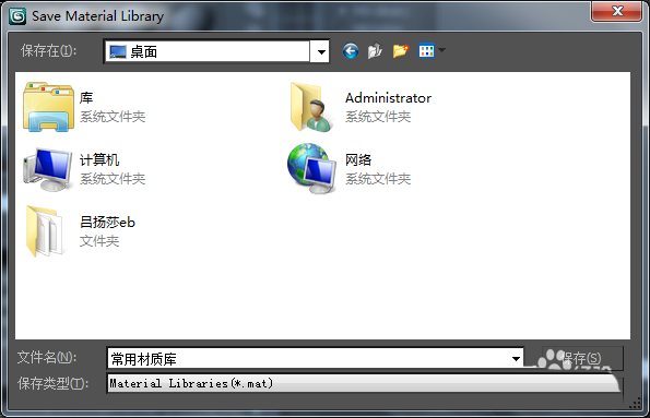 3、在彈出的【Save Material Library】(保存材質(zhì)庫)對話框中選擇一個路徑,在【文件名】文本框中輸入“常用材質(zhì)庫”,然后單擊【保存】按鈕,如下圖所示。此時,材質(zhì)庫的文件名即變?yōu)?quot;常用材質(zhì)庫.mat“,這樣就創(chuàng)建了一個新的空材質(zhì)庫,我們可以將調(diào)配好的材質(zhì)保存到材質(zhì)庫中。