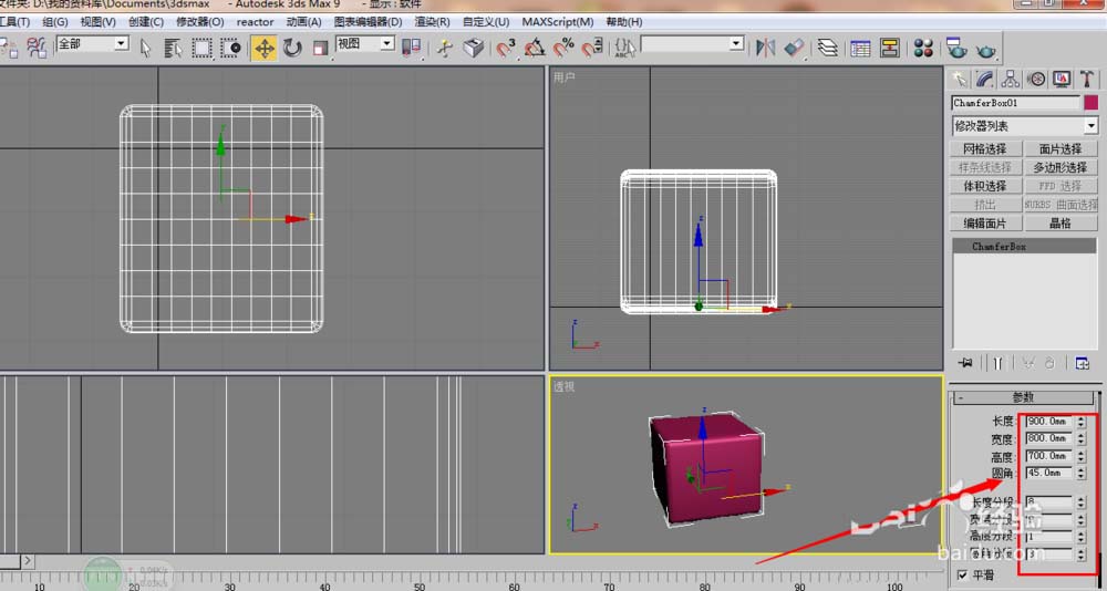 2、輸入如圖這里是長、寬、圓為,900、800、45。長度、寬度分段設置為8、9。