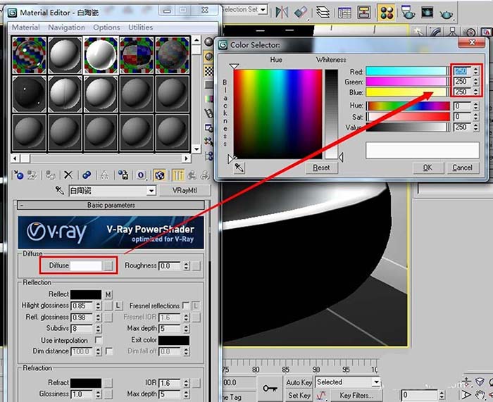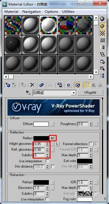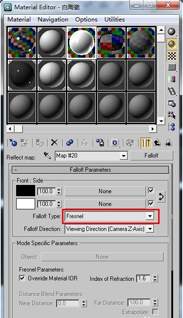 2、將當前的材質指定為【VRayMtl】(VR材質),將材質命名為“白陶瓷”,設置【BasicParameters】(基本參數),在【Reflection】(反射)通道中添加【Falloff】(衰減)貼圖,其他參數的設置如下圖所示。