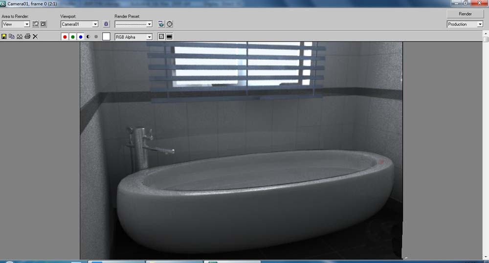 5、將調制完成的白陶瓷材質賦予浴缸,快速渲染并觀察效果如下圖所示。