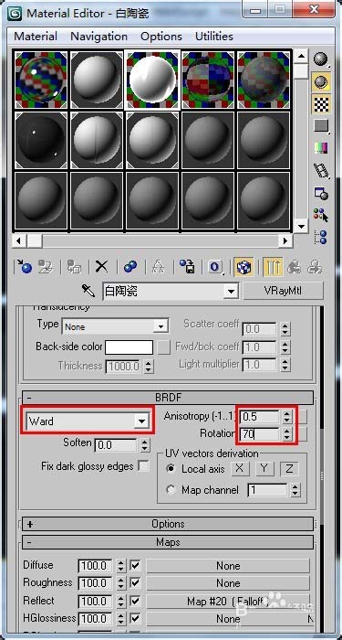 3、在【BRDF】卷展欄中選擇【Ward】(沃德)類型,使用該方式渲染出來的材質整體上比較亮,調整【Anisotropy】(各項異性)參數,如下圖所示。