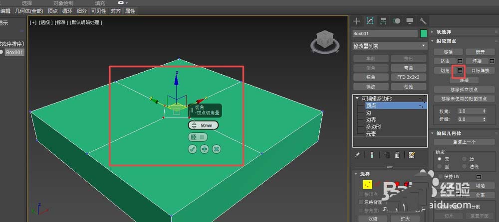 4、然后點擊其頂點層級,選中中間一點,給它設置一個切角,點擊切角設置按鈕,設置切角量為50.