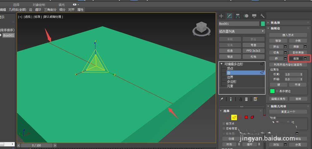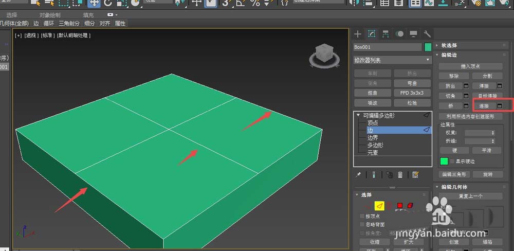 2、然后選擇修改面板中可編輯多邊形下的邊層級,按ctrl鍵累加選擇兩條對邊,然后按連接按鈕,這樣長方體中間多了一條線。