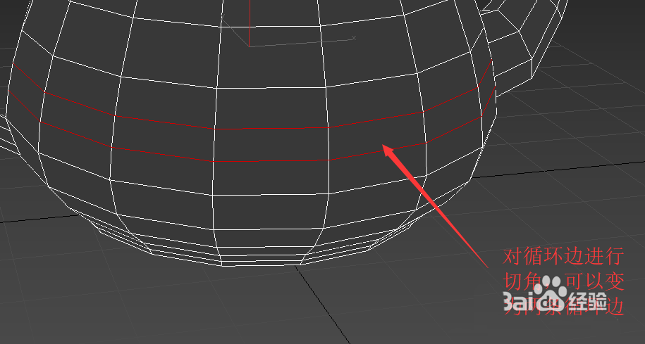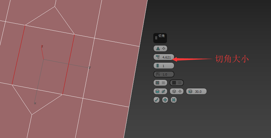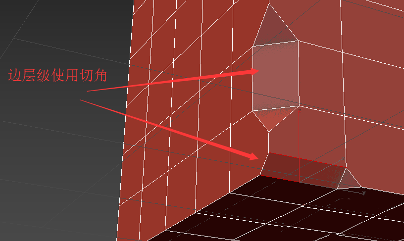 4、在邊層級使用切角效果如圖。切角命令會去除該邊,并在該邊兩側(cè)的兩個面上插入兩條邊。