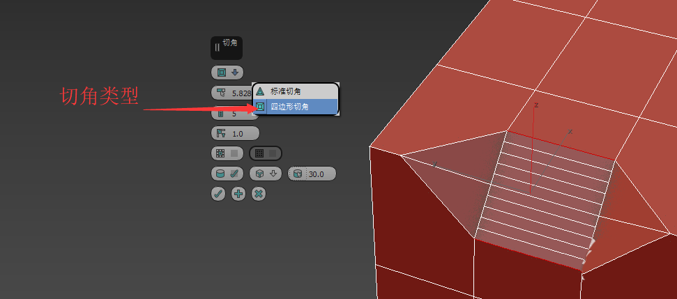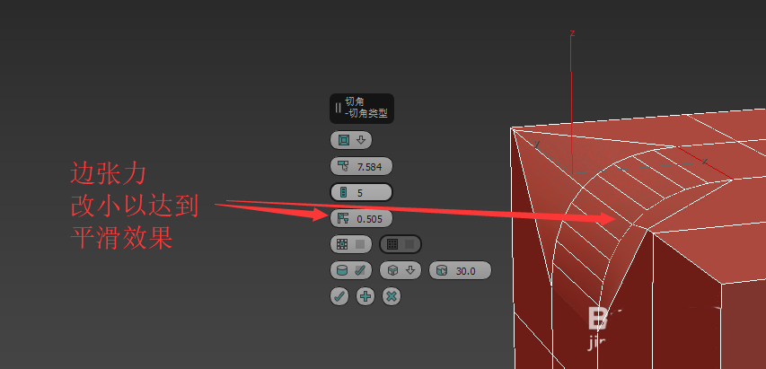 8、還有兩種切角類型可以選擇。并且第二種切角類型:四邊形切角有張力設(shè)置。可以改變平滑程度。效果如圖。