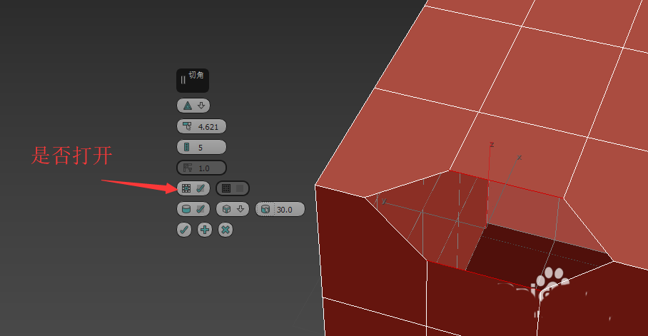 3、頂點(diǎn)層級的切角只有一個設(shè)置選項(xiàng),就是是否開口。效果如圖。(打開設(shè)置的方法是點(diǎn)擊切角按鈕旁邊的小三角)