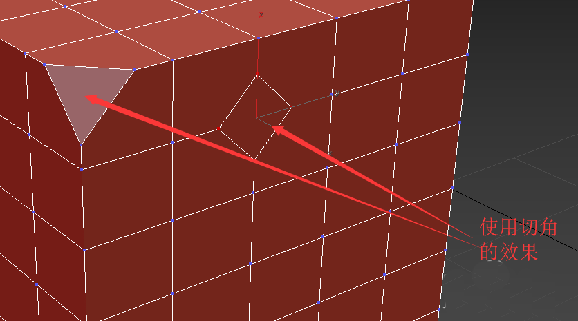 2、切角工具有快捷操作。只需要按下切角按鈕,直接在一個頂點(diǎn)/邊上拖拽就可。如圖,切角的效果是去除該頂點(diǎn)并用幾條相連邊上的插值點(diǎn)替代。