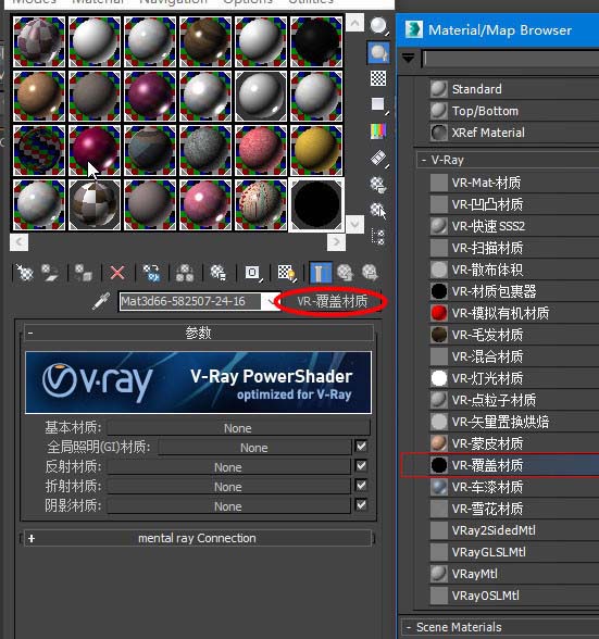 1、首先,打開3d max軟件,按“M”鍵調出“材質設置面板”,選擇一個空白的材質球。點擊“標準”按鈕,在彈出的對話框中選擇“vray覆蓋材質”。