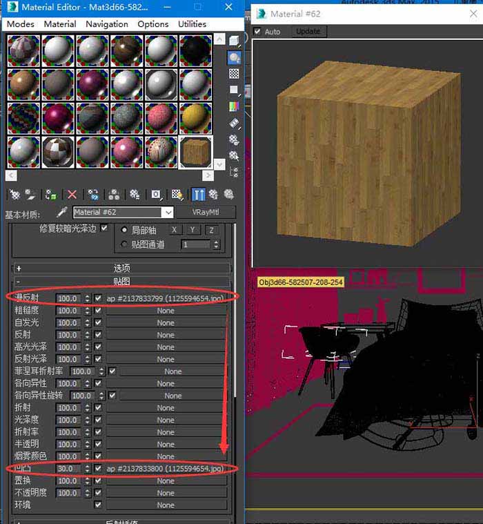 2、選擇“基礎材質”子層級,選擇“vray材質”,在“漫反射”通道和“凹凸”通道中均添加木地板材質貼圖。