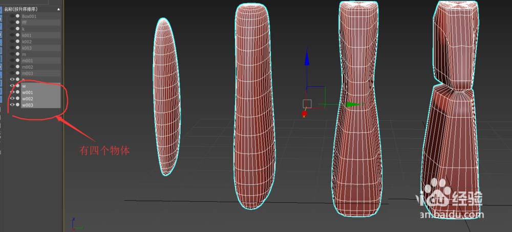 1、首先,我們有四個對象用來說明。先說合并多個對象為一個的辦法。選中其中一個物體,并按下建模選項卡下的附加按鈕。