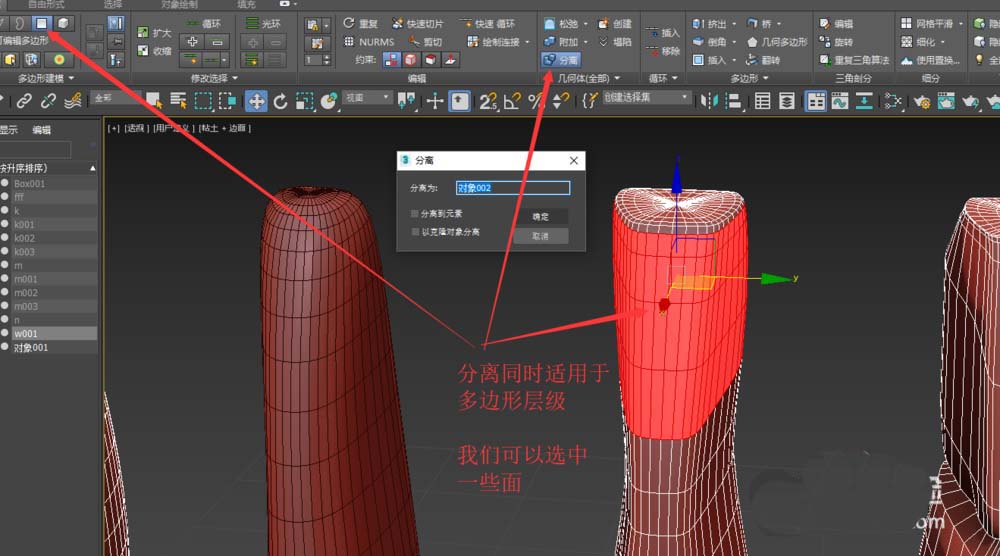 3、分離操作還可用于多邊形/邊/點層級。比如在多邊形層級,我們選中一些多邊形,點擊分離,效果如圖。