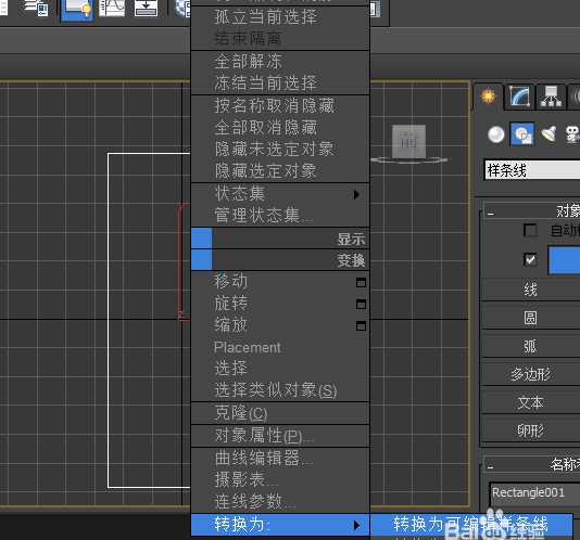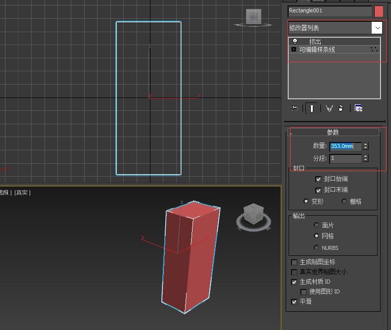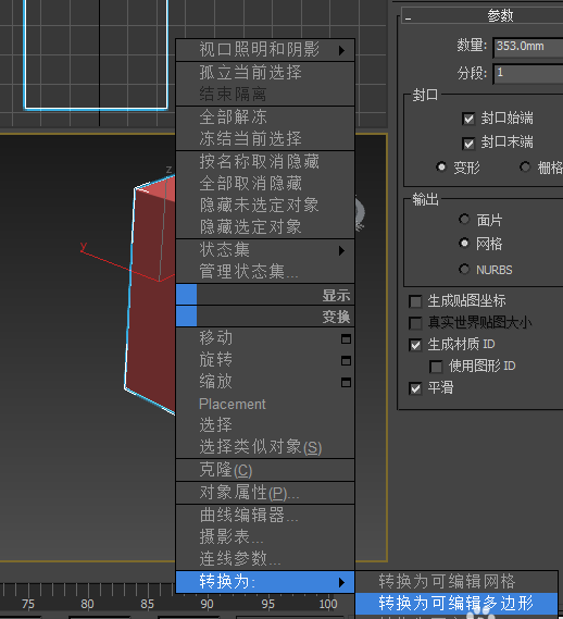 3、選擇剛才繪制的矩形并單擊鼠標(biāo)右鍵,執(zhí)行(轉(zhuǎn)換為),轉(zhuǎn)換為可編輯樣條線命令,然后加載(擠出)修改器,設(shè)置(數(shù)量)為353mm.如圖。