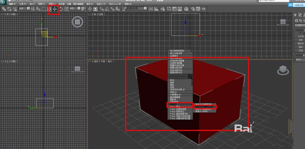 3、用移動(dòng)工具選中長方體,右擊鼠標(biāo),將長方體轉(zhuǎn)化成可編輯多邊形