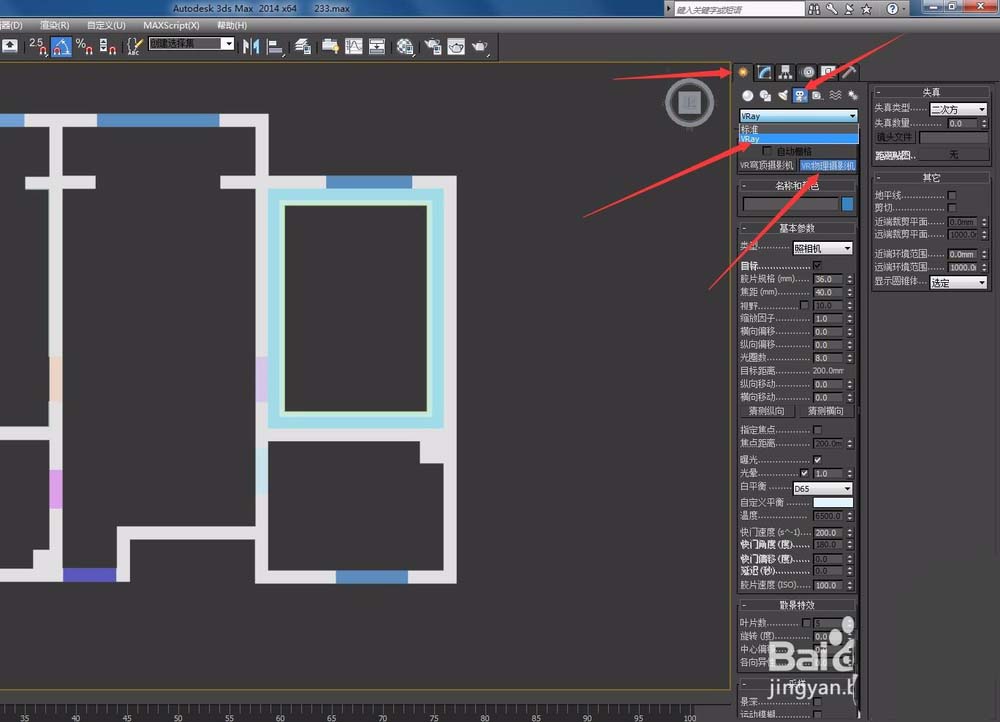 2、修改面板里面注意事項:①可以看到下面有很多可以修改的選項,其中“焦距”和“膠片規格”之間的配合可以調整你的視角長遠,可以修改這兩個數值來達到自己適合的視角,焦距不應該小于24,膠片規格不應該大于50,否則你的屋子效果就變形很嚴重。