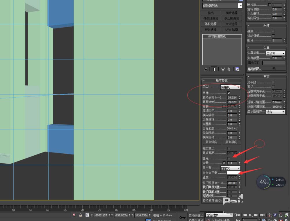 3、修改面板里面注意事項:②下面的“曝光”關掉的話,整體就和標準相機一樣的效果,如果不關的話,請參照第四步調整快門膠片速度,否則畫面將是一片漆黑 ③“光暈”改小,0.3-0,5為宜,(如果是1的話畫面四周有些黑,很少能用到1),有光暈增加房間的縱向深度④自定義平衡后邊的顏色改為純白(白平衡偏暖,畫面偏冷,白平衡偏冷,畫面偏暖)