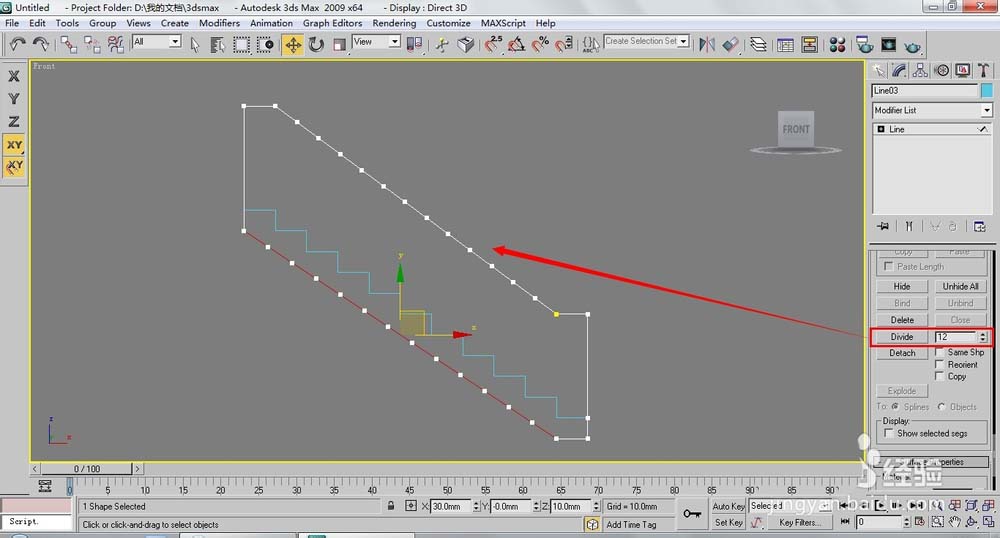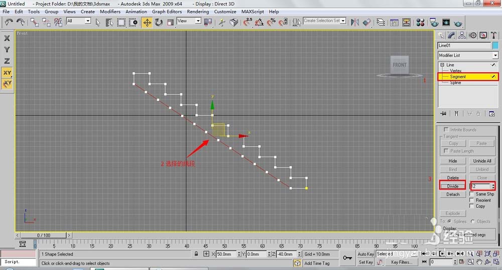3、按下2鍵,進入(線段)層級,在前視圖中選擇下面的線段,然后在【Divide】(拆分)右側的數值框中輸入12,在單擊【Divide】(拆分)按鈕,此時選擇的線段添加了12個頂點,如圖。