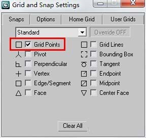 1、單擊工具欄中的(捕捉)按鈕,將鼠標光標放在上面,單擊鼠標右鍵,彈出【Grid and Snap Settings】(柵格和捕捉設置)對話框,勾選【Grid Points】(柵格點)復選框。