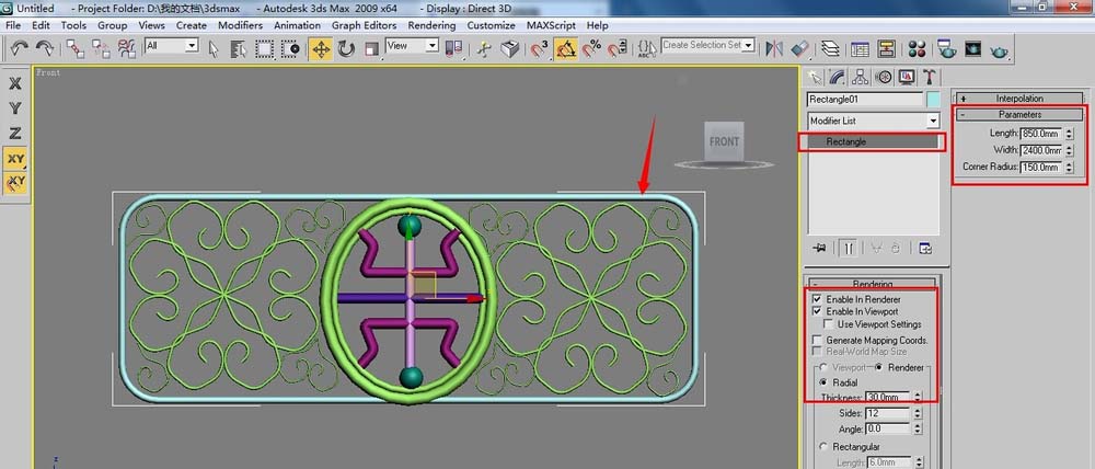 6、繪制大小為850*2400、角半徑為150的矩形,設置【Rendering】(渲染)卷展欄下的【Thickness】(厚度)為30,效果如圖。