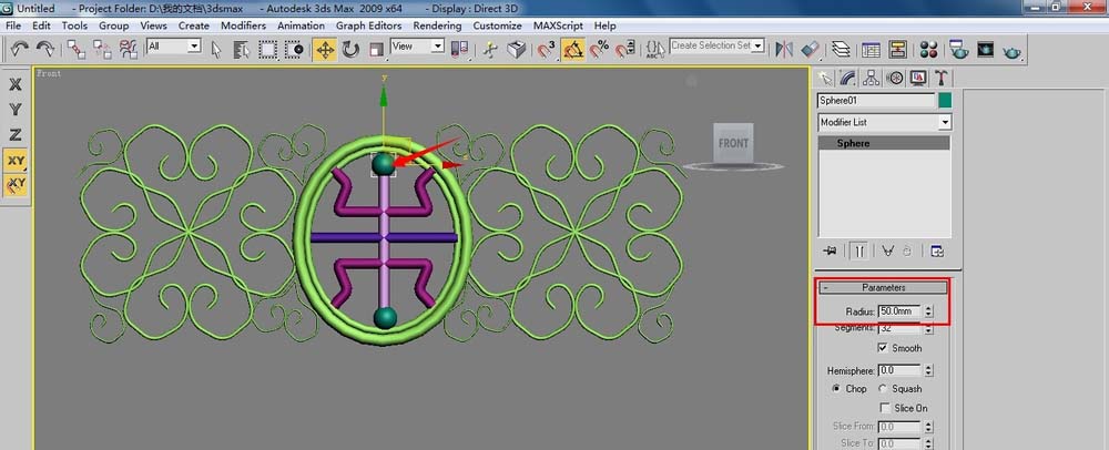 5、在前視圖中穿件一個半徑為50的球體,復制出多個球體并移動到直線的兩端和四連花中心處。