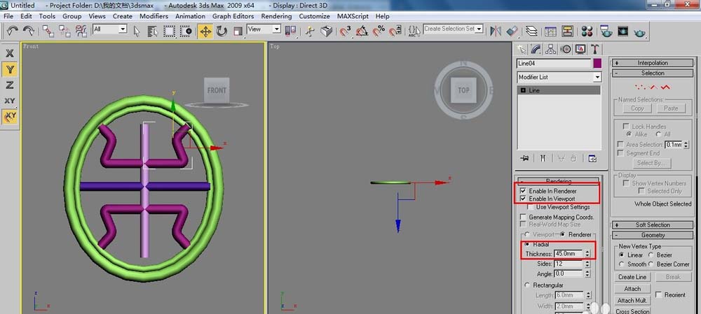 2、用直線繪制并進行修改,得到如圖的線形,設置【Rendering】(渲染)卷展欄下的【Thickness】(厚度)為45。