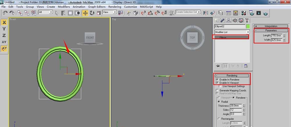 1、單擊(創建)/(線形)/【Ellipse】(橢圓)按鈕,在前視圖中繪制一個大小為830*700,可渲染厚度為50的橢圓,并在原位置直接復制出一個,修改其大小為755*625,可渲染厚度為30,再用對齊命令對齊。